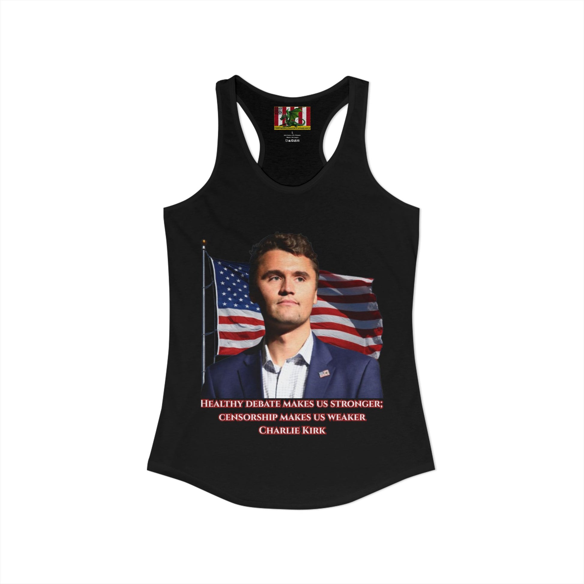 Charlie Kirk, Healthy Debate Women's Racerback Tank Top by theGreenDragonTavern.shop