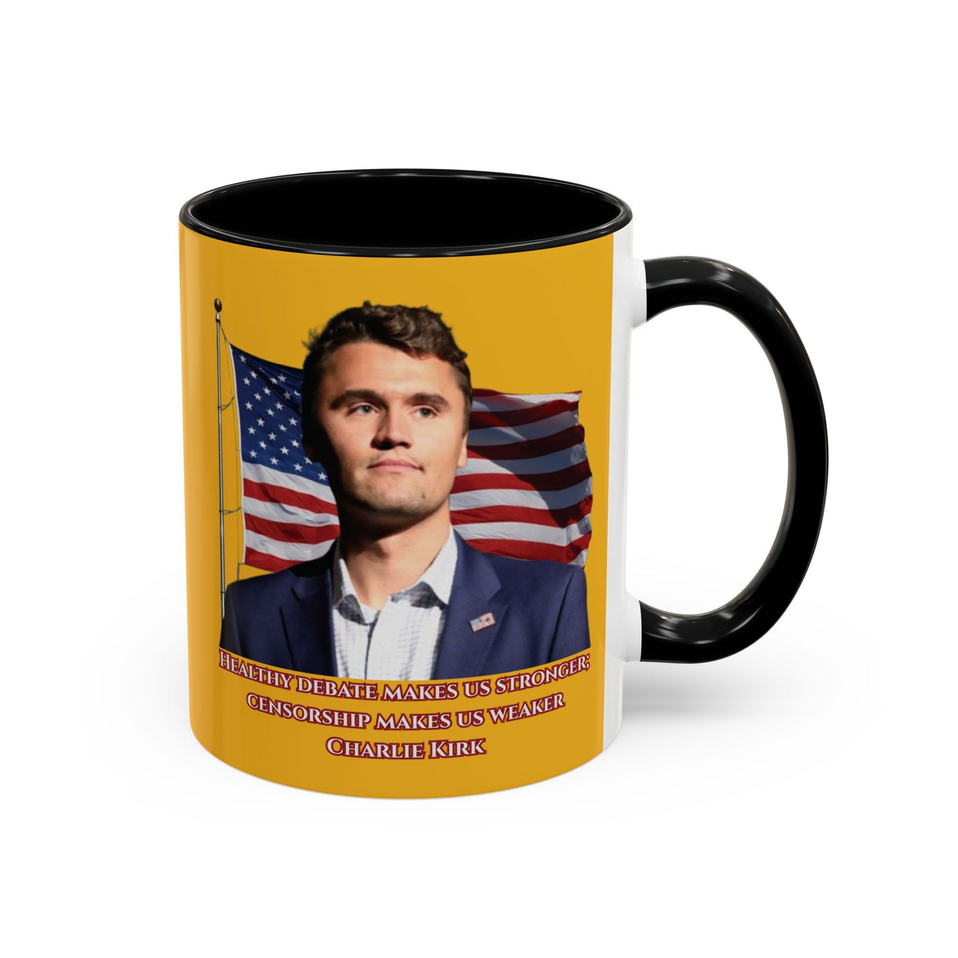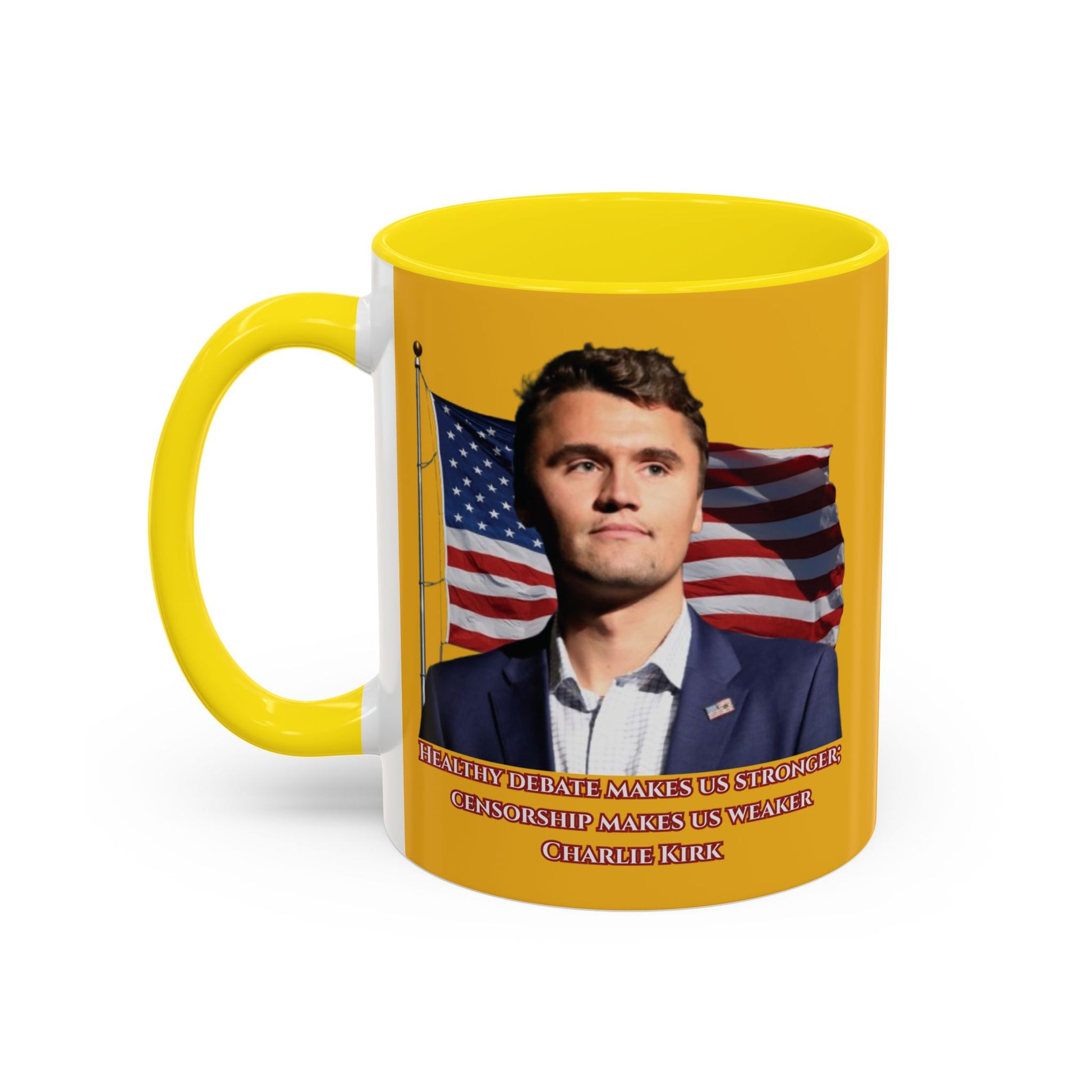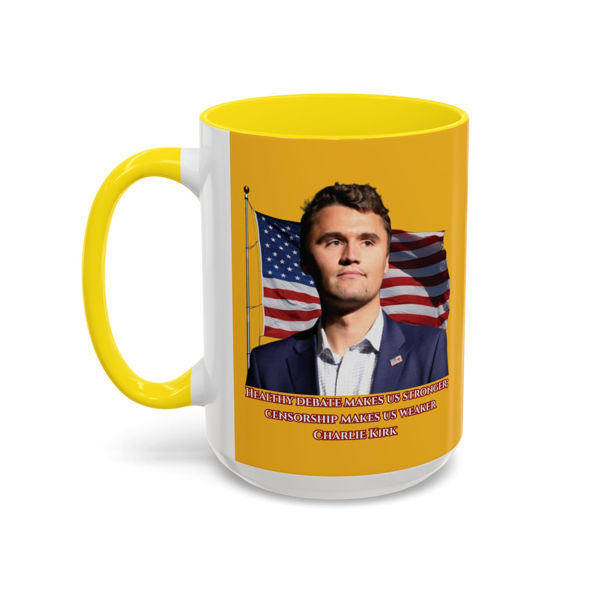 Charlie Kirk, Healthy Debate Yellow Accent Mug by theGreenDragonTavern.shop