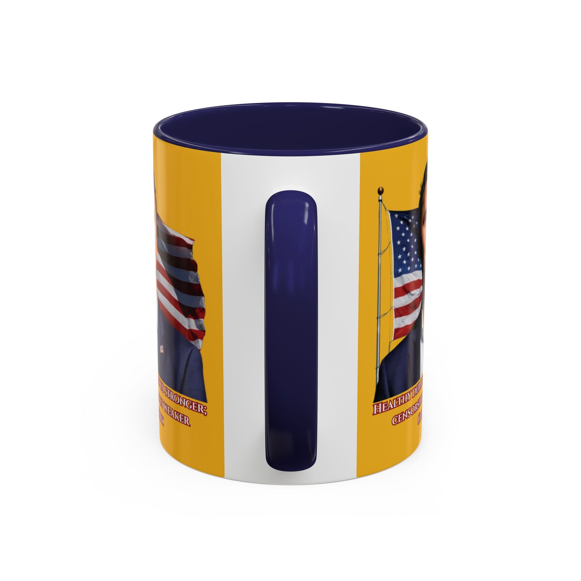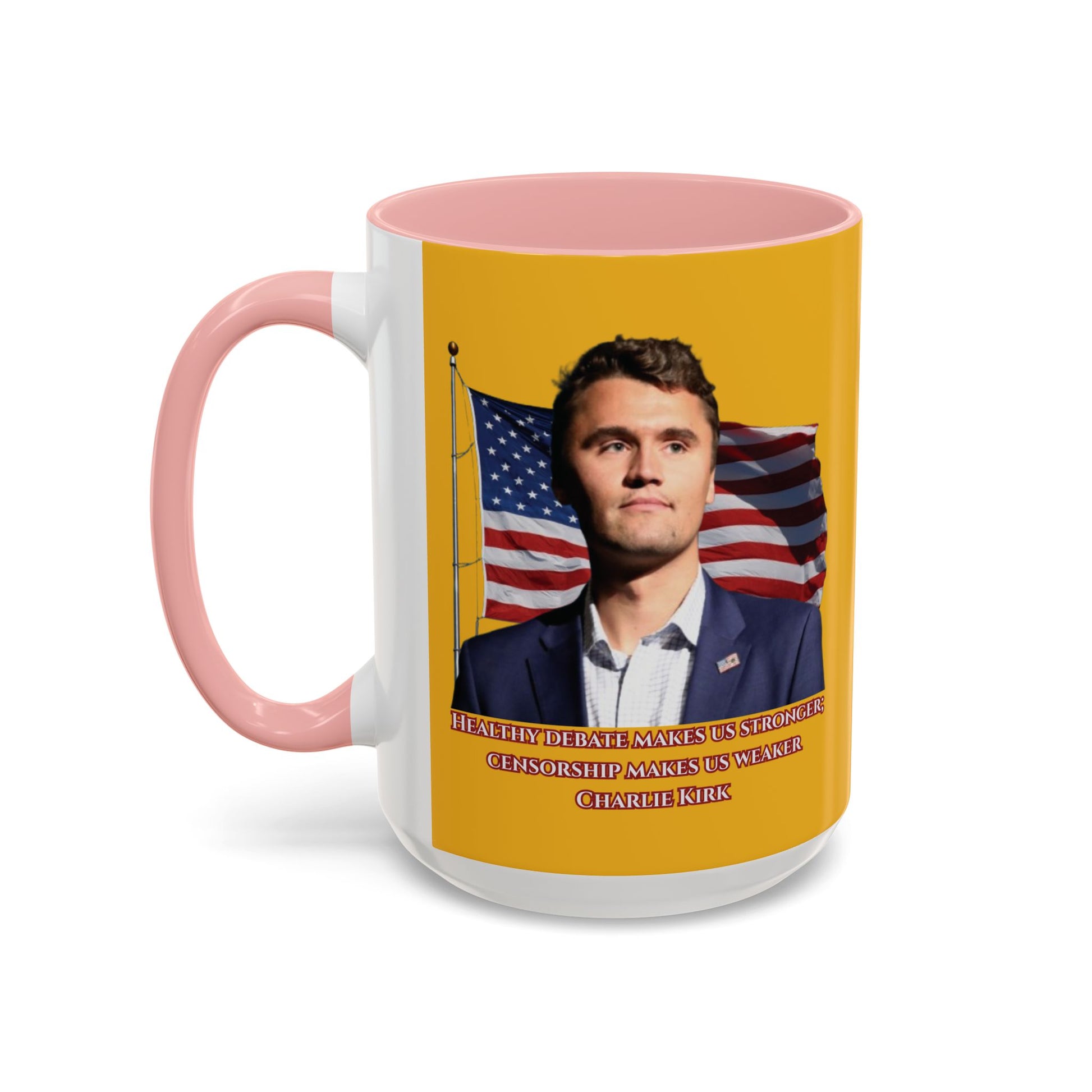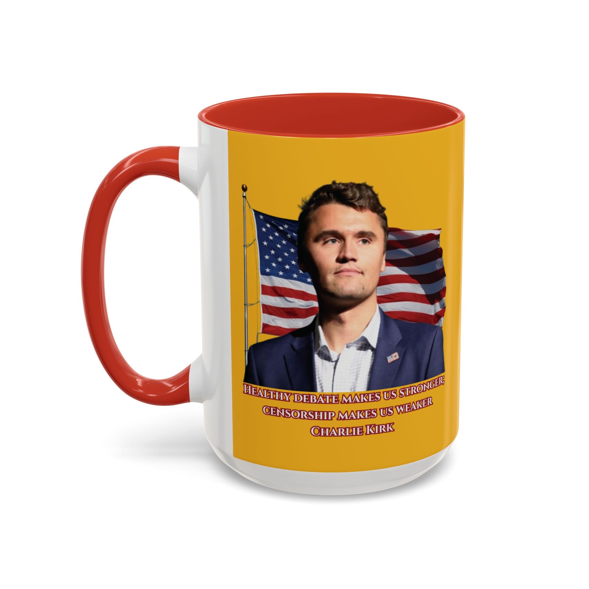Charlie Kirk, Healthy Debate Yellow Accent Mug by theGreenDragonTavern.shop