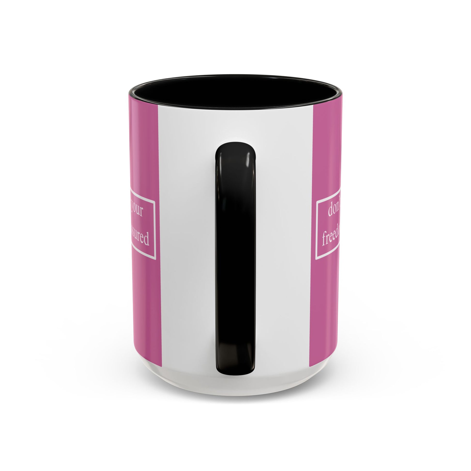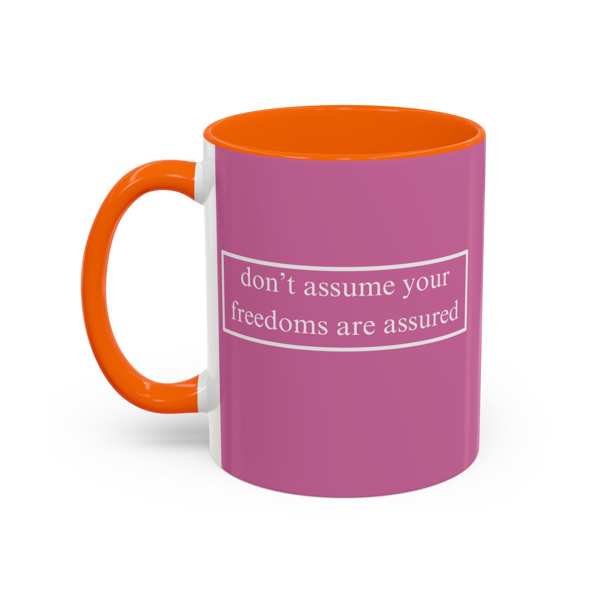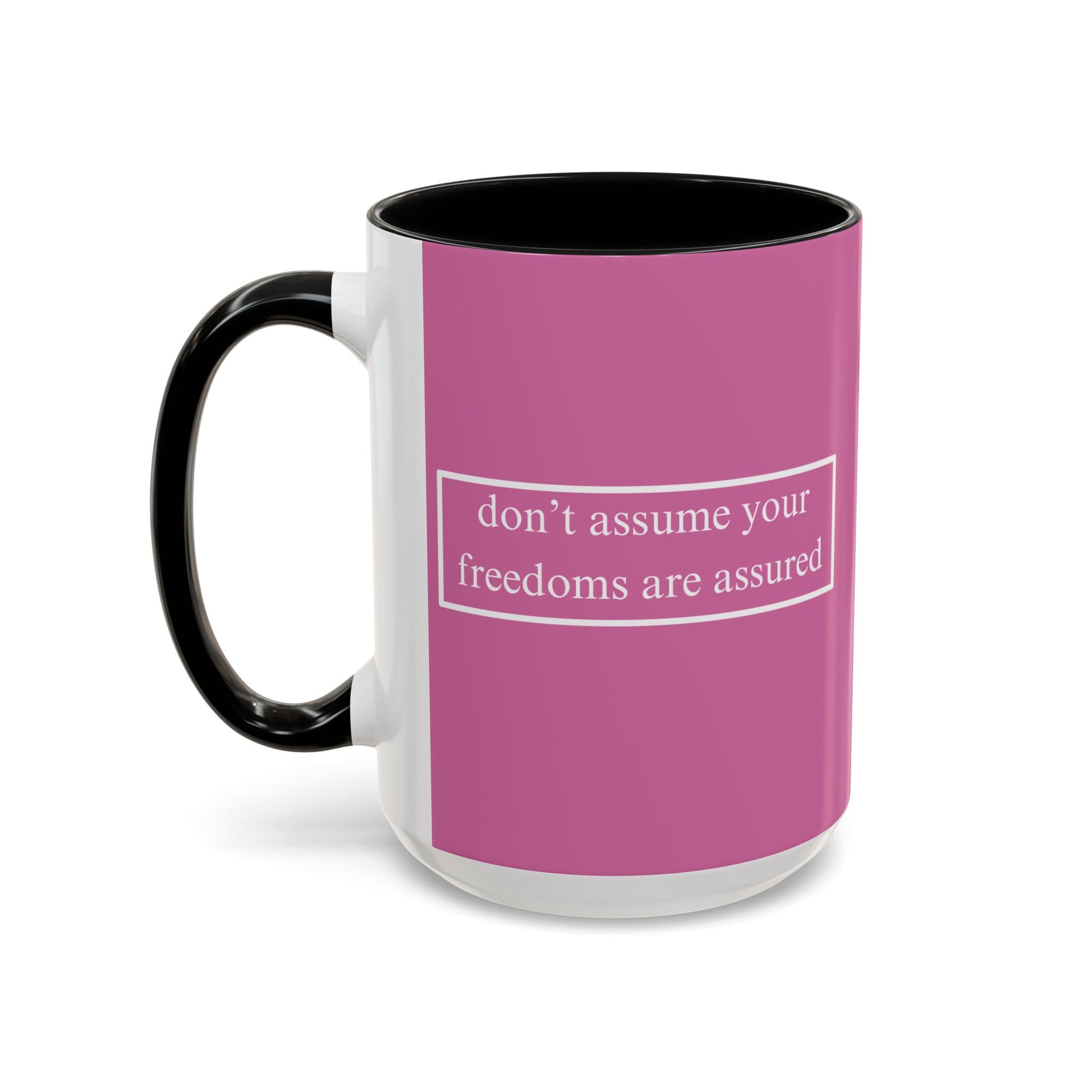 don't assume your freedoms are assured White font Pink Accent Mug by theGreenDragonTavern.shop
