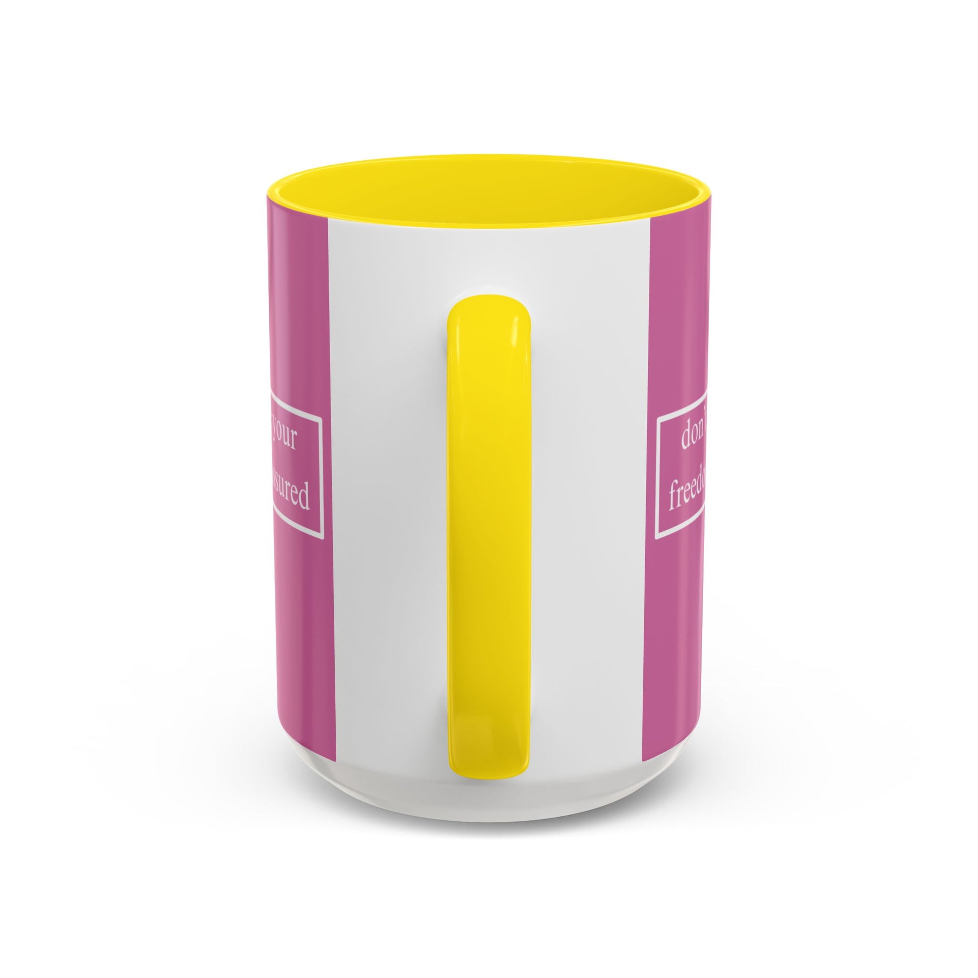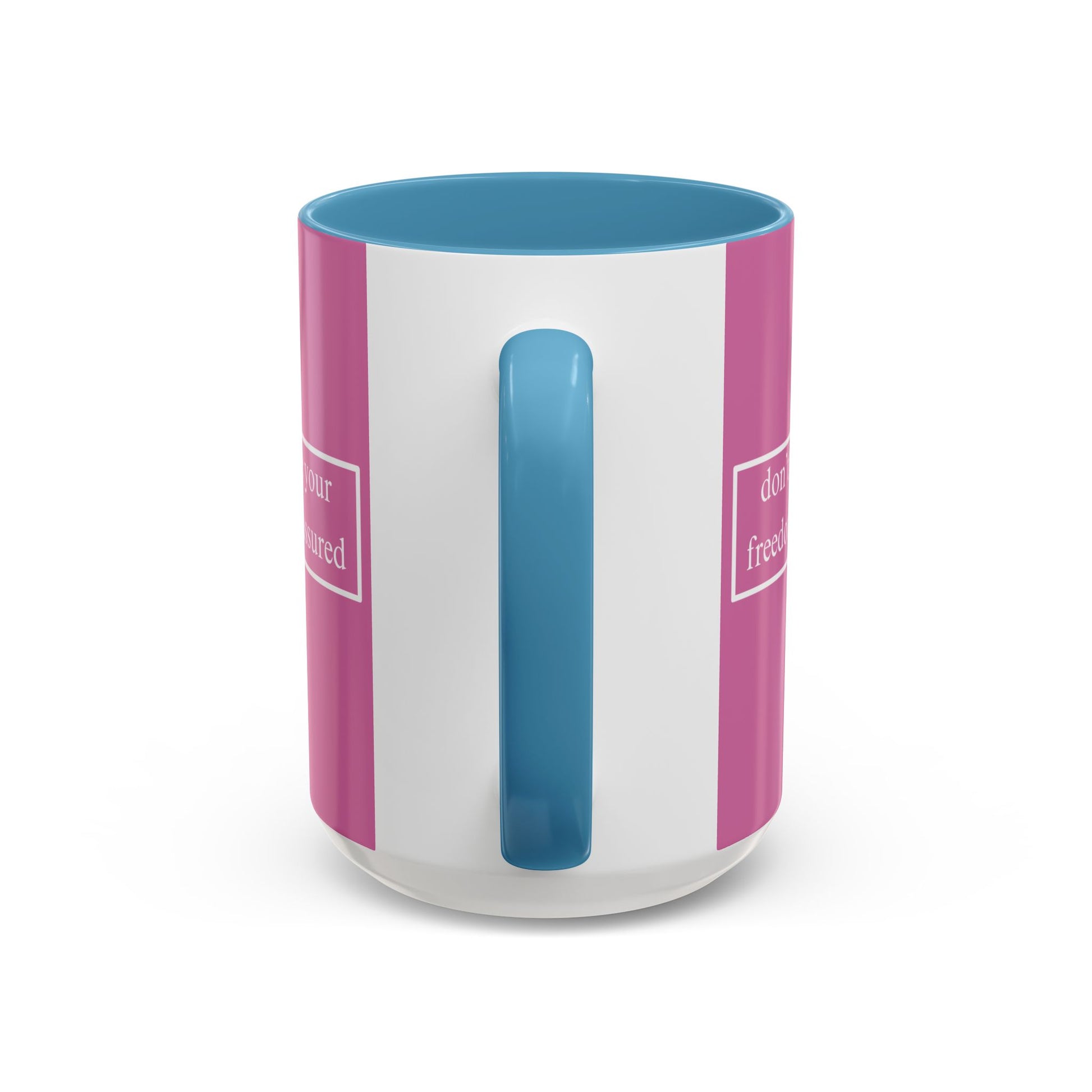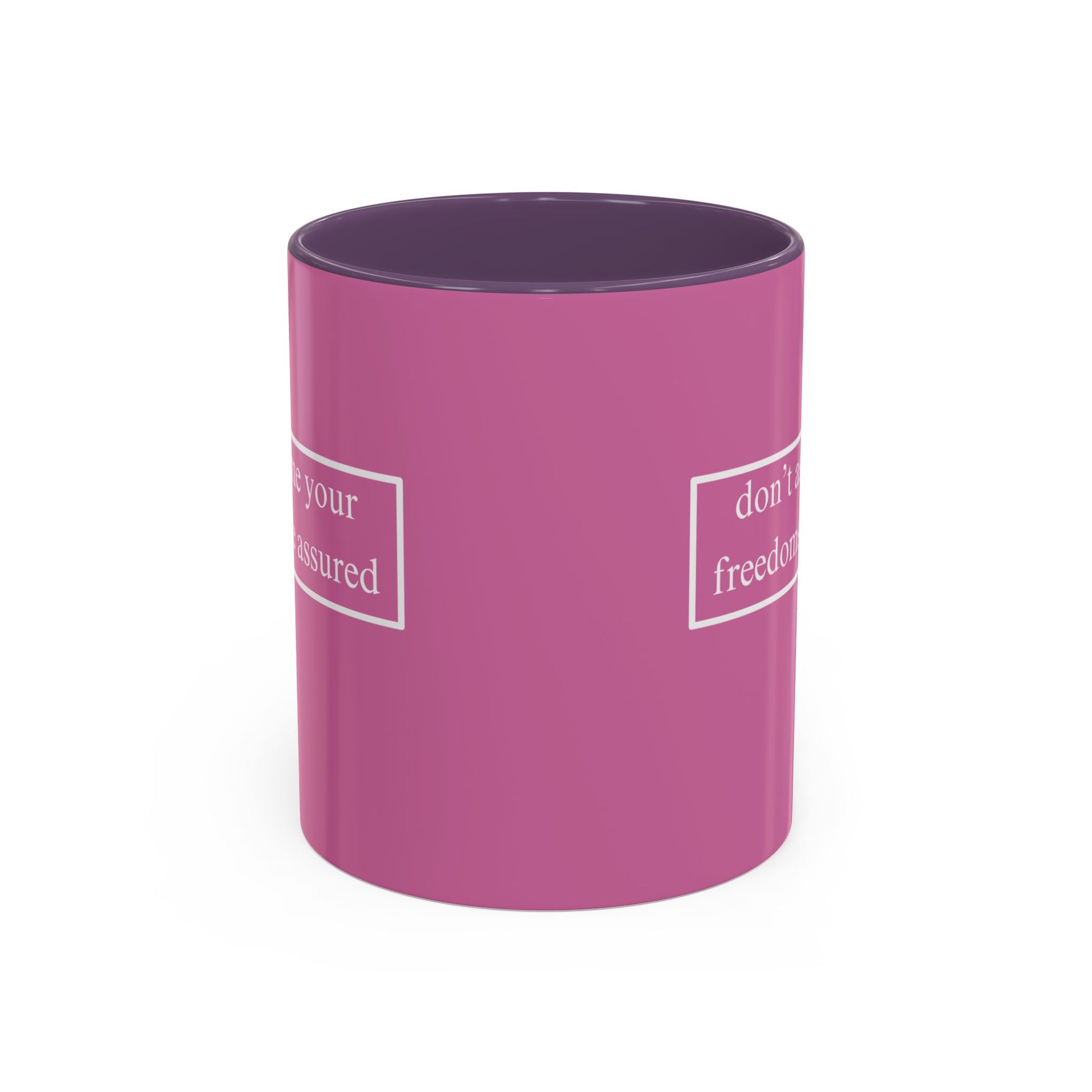 don't assume your freedoms are assured White font Pink Accent Mug by theGreenDragonTavern.shop